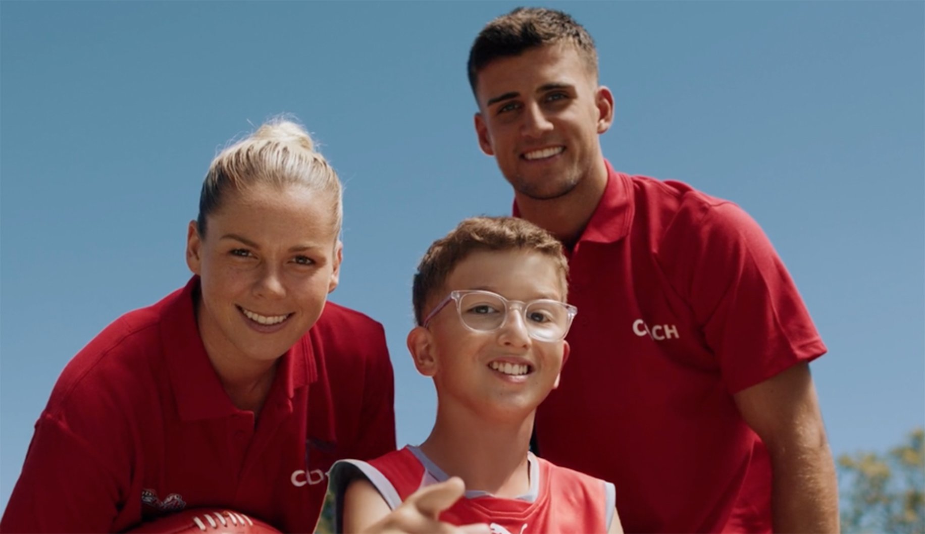 A smiling woman, a smiling man, and a young boy with glasses, all wearing red sports jerseys, outdoors on a sunny day