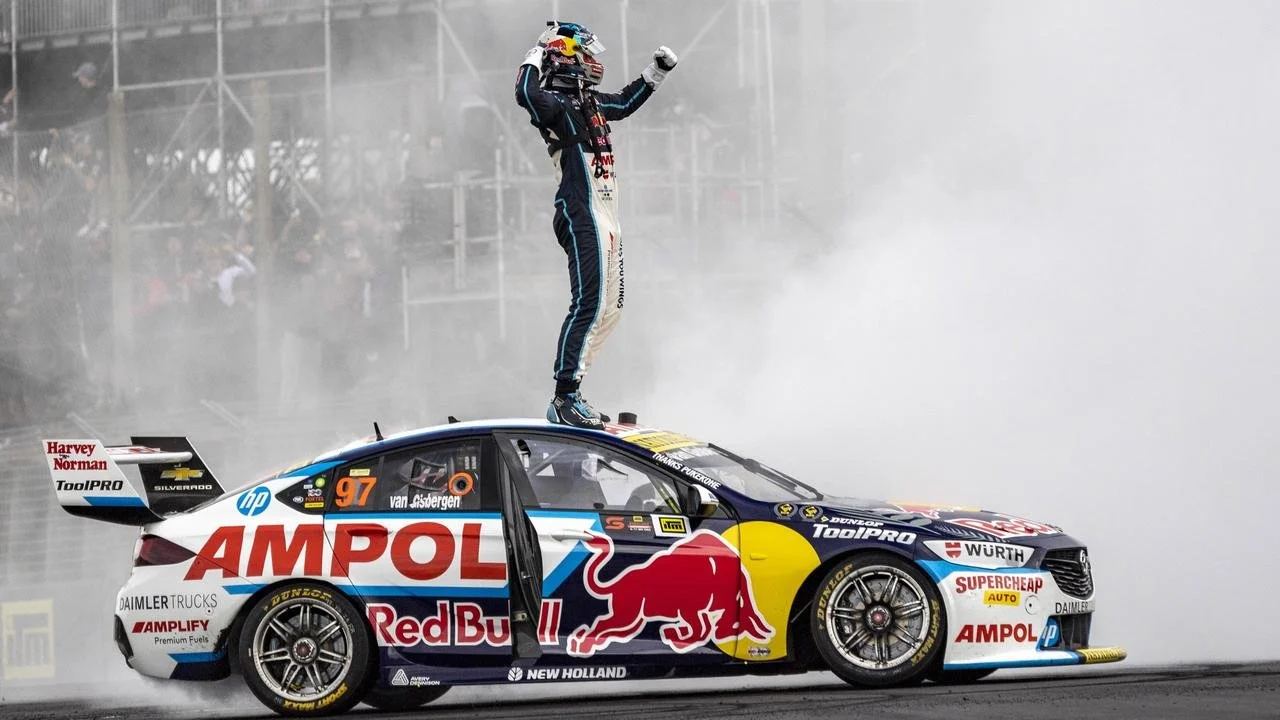 Race car driver standing on top of a race car celebrating victory at a racing event, with smoke or fog in the background.